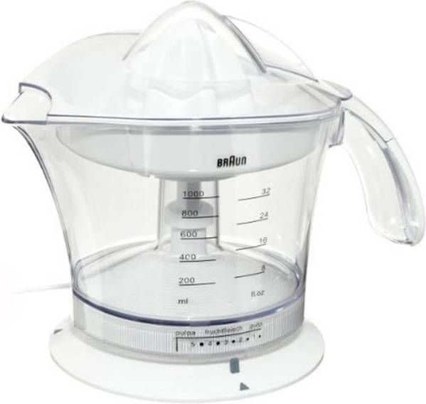 Citromatic compact design, gemakkelijk in het gebruik en gemakkelijk schoon te maken. Sinaasappels, mandarijnen, grapefruit, citroenen of limoenen? De Braun Multiquick Citrus pers maakt er in enkele seconden een vitaminerijk vruchtenspap van direct in jouw glas getapt en met zoveel of zo weinig pulp als je lekker vindt. Verstelbare pulpregeling Door de saphouder op de basis te draaien, wordt de opening die de pulp tegenhoudt groter of kleiner. Dus of het nu van sinaasappels, mandarijnen, grapefruits, citroenen of limoenen is, iedereen kan de exacte hoeveelheid pulp in zijn sap bepalen, voor de kinderen bij het ontbijt of voor de cocktails 's avonds. Eenvoudig schoon te maken Alle onderdelen van de Braun multiquick Citruspersen zijn ontworpen om makkelijk te worden gereinigd.