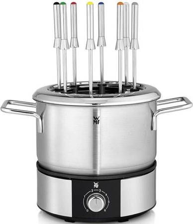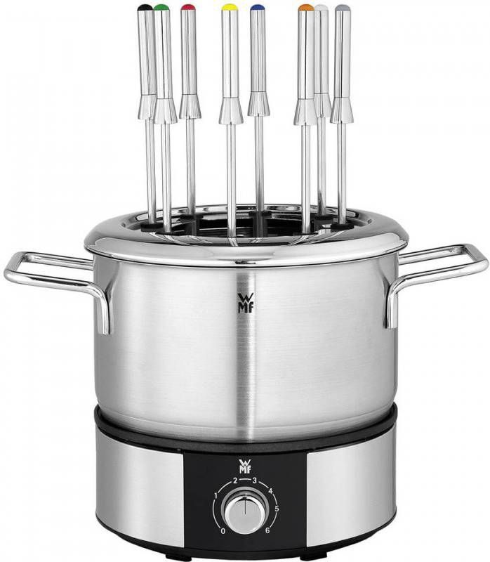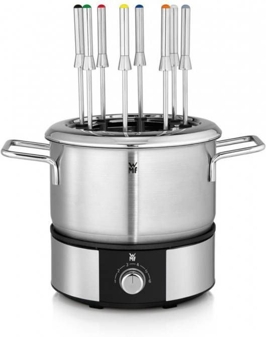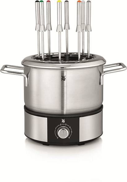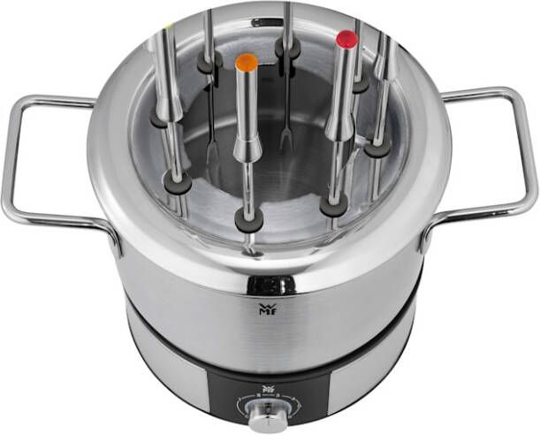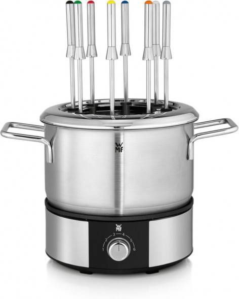Met deze fonduepan van WMF kunt samen met vrienden of familie heerlijk genieten van fonduen. De pan heeft een inhoud van 1,5 liter en komt met acht hoogwaardige fonduevorken die gemaakt zijn van Cromargan®. De variabele temperatuurinstelling en 1400 Watt vermogen zorgen ervor dat de olie of bouillon snel heet wordt, waardoor u snel kunt genieten van het heerlijke eten. Elke fonduevork heeft een eigen parkeerpositie en potinzet. De pan is geschikt voor maximaal acht personen.